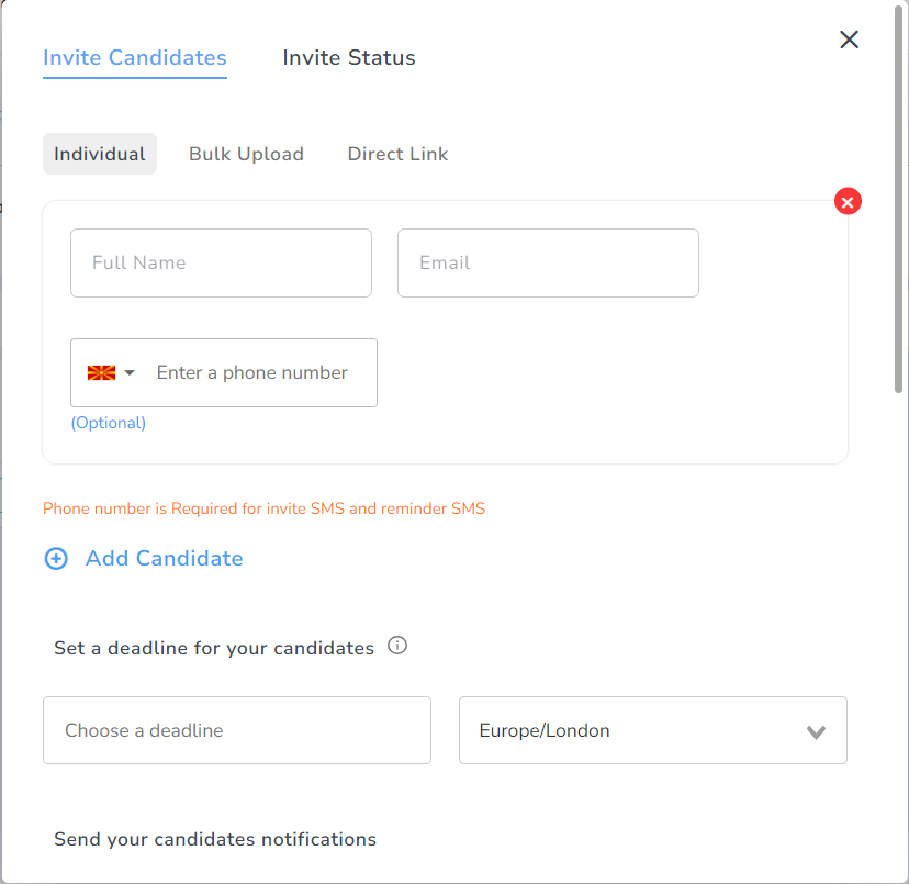 Fill in the Name, Email and Phone Number (optional) of your candidate.