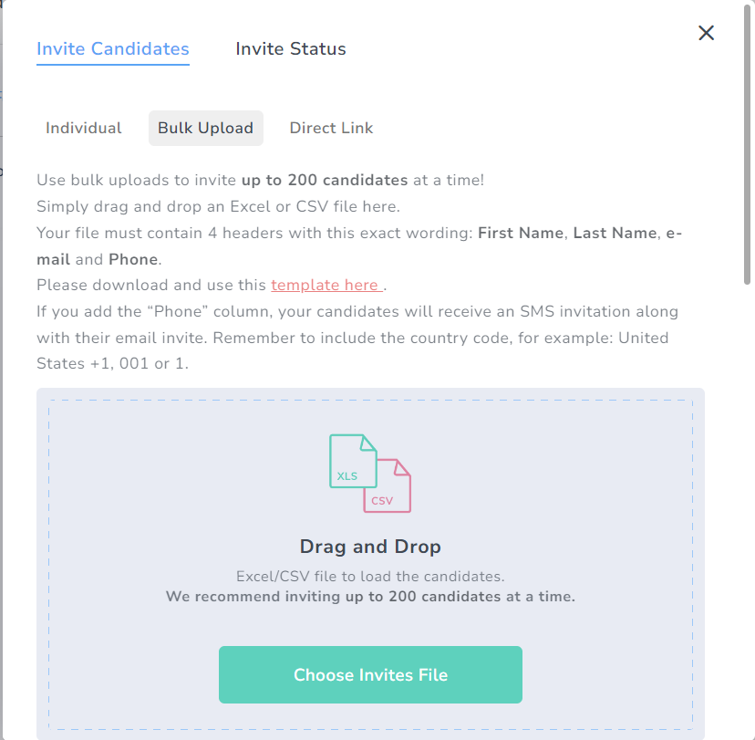 Then fill in the candidates' info by first name, last name, email and phone number. Once you've saved this CSV/Excel file, you can upload it by drag-and-drop or "Browse Files" option.