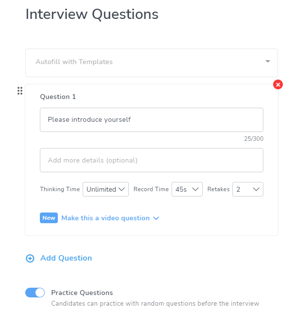 Set up each Question: enter the question, then further details in a separate field if needed. Set the number of Thinking time, Record time and Retakes. Use the red X to the top right of a question to delete it, and the 'Add Question' button beneath the current set of questions to add more. The maximum amount of questions you can add is 10. If you wish to rearrange the questions, click and drag the 6 dot icon on the