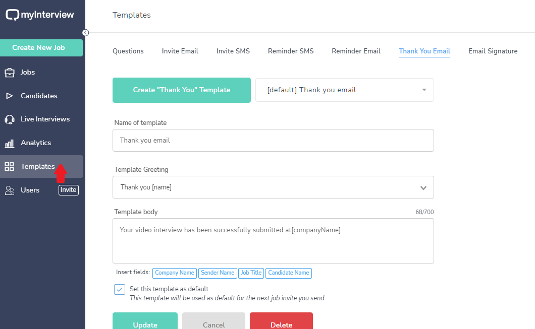 You can create and customize your “Thank you” email in the Templates section of your myInterview dashboard.
