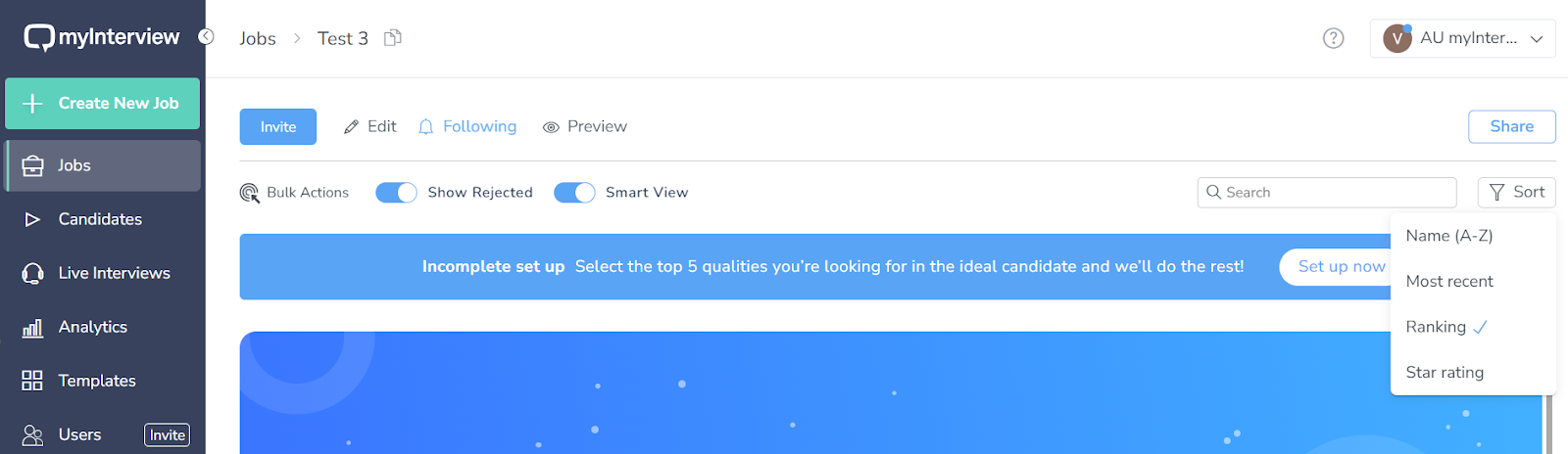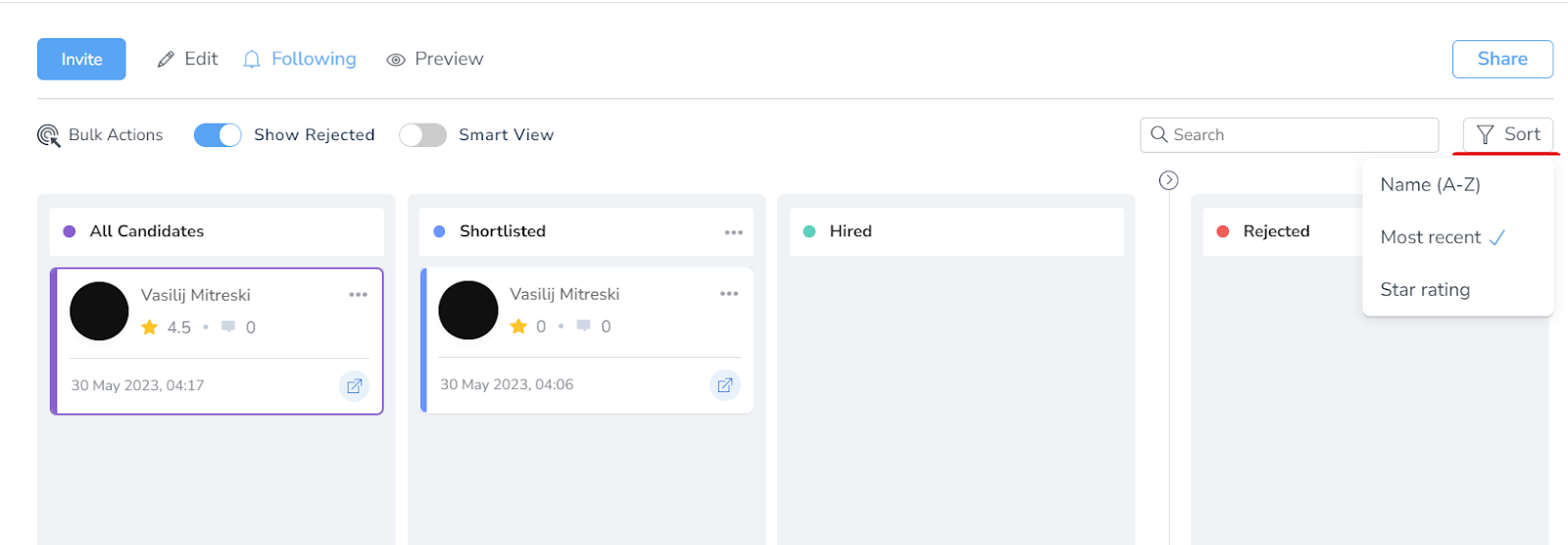 When you are in intelligence view, click on the Sort By button to sort candidates by name, most recent, ranking, rejected. Moreover, by clicking on the “Sort” button when you are in the ”Smart View”, you can organize the candidates by “Ranking” on top of sorting the candidates by name, most recent, and star rating.