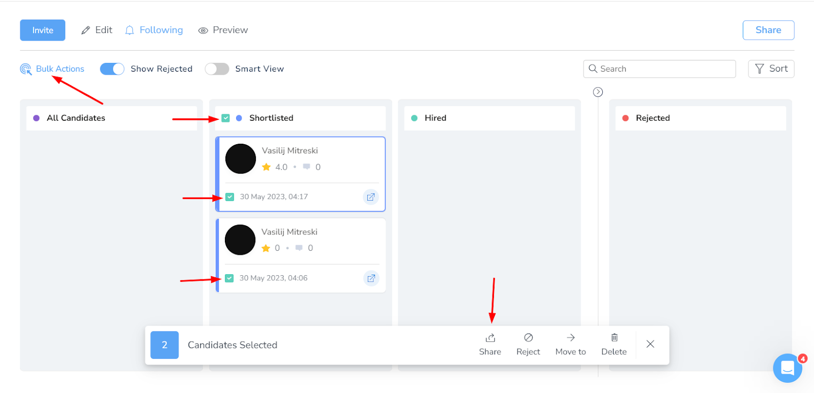If you want to share multiple candidates at the same time, the “Bulk Actions” feature is perfect for your needs! Just by clicking on the “Bulk Actions” button and selecting the boxes of your designated candidates (even the whole column), you can share all of the links at once, or you can share them as an invitation via an email address which will expire after 15 days!