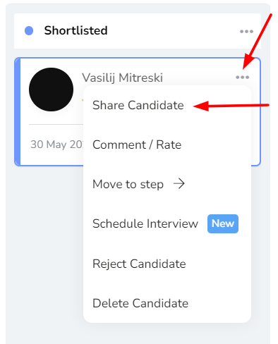 Click on the '3 dots' on a candidate card and select “Share Candidate”