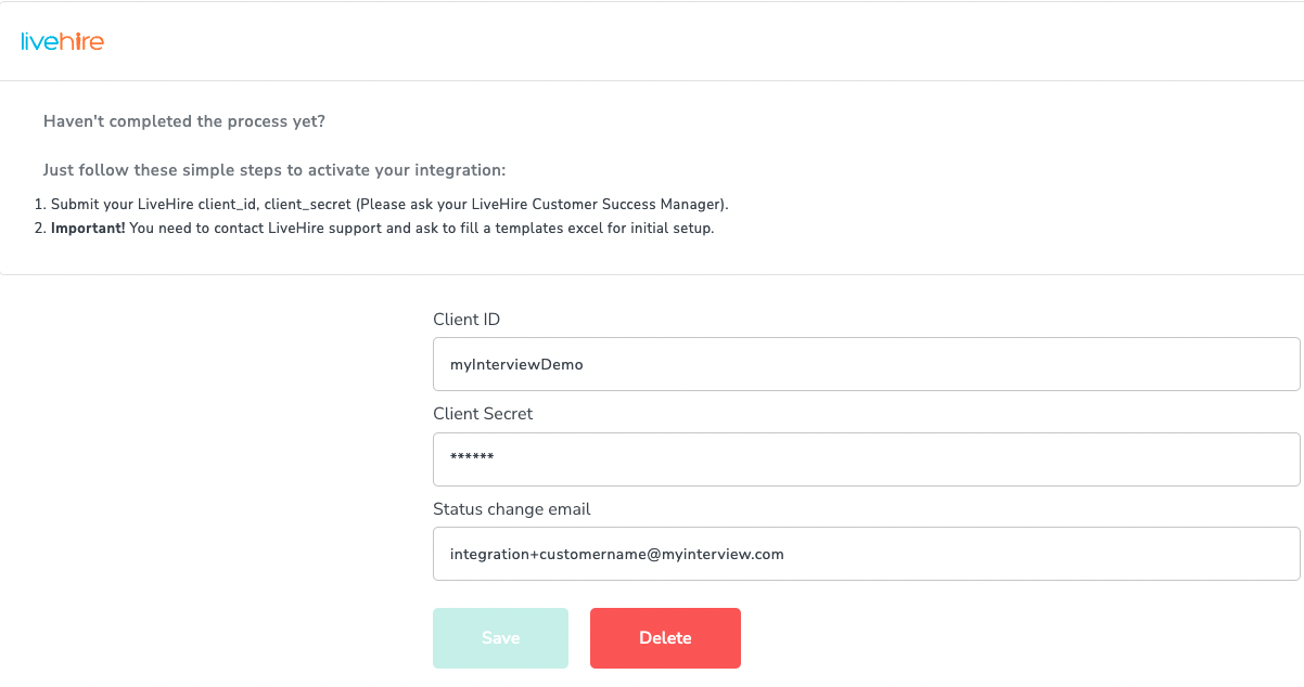 3. Enter in your LiveHire client_id, secret_id and status change email obtained from your customer success manager. The status change email will be responsible for all notes and communications inside LiveHire.