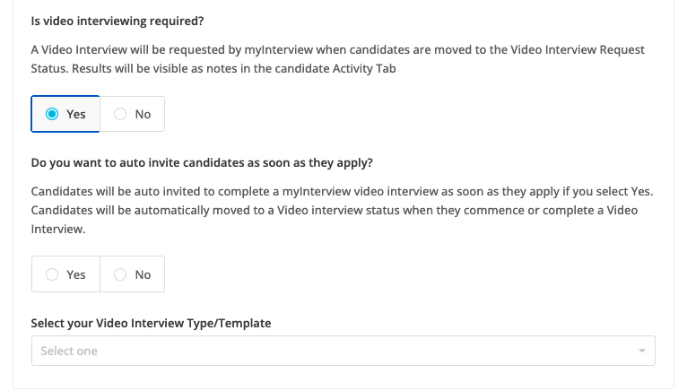 In LiveHire under job details select ‘Yes’ to Is Video Interviewing Required.