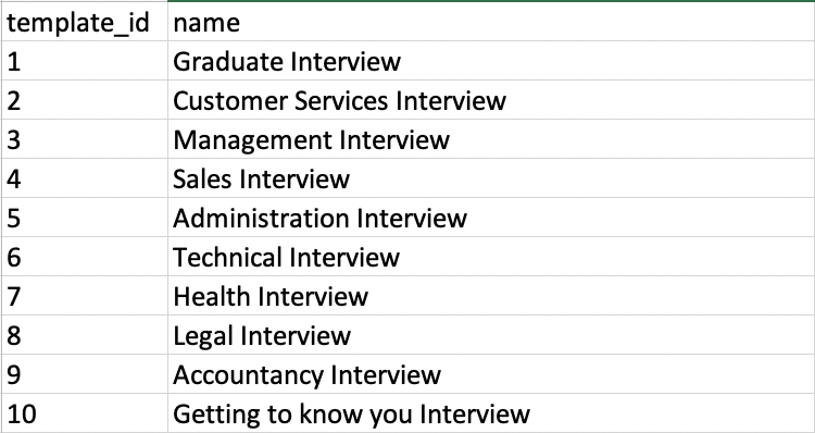 Once you have set up your question templates, you can download the templates file which will contain both the id and name. Please send this file to LiveHire via support@livehire.com.