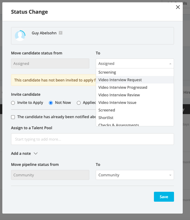 When you’re ready to invite a candidate to their video interview, simply click on their stage and select ‘Video Interview Request’