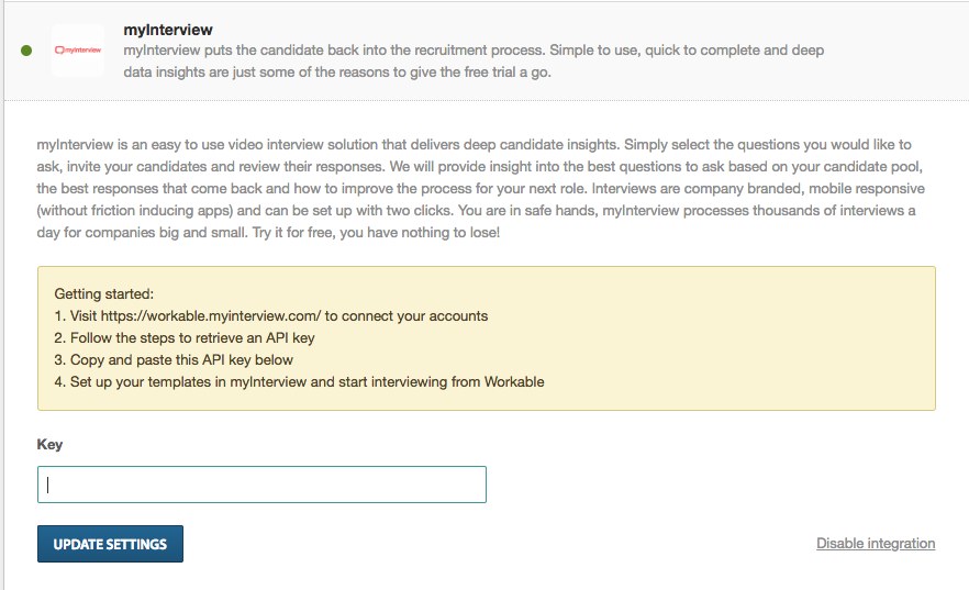 Select the Add Integrations button, choose Workable and continue through to receive your API Key. Keep this on hand, and set up your Templates if you haven't already.
