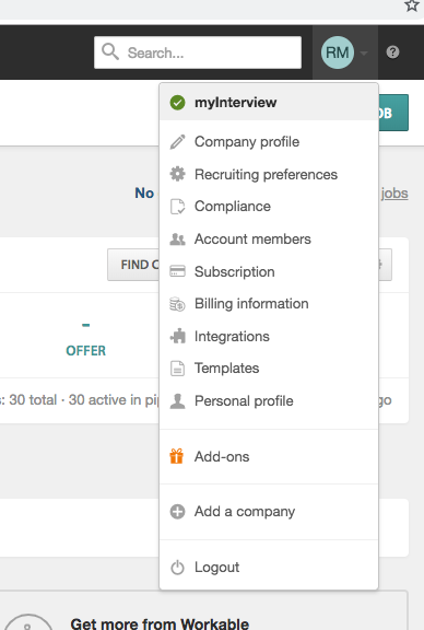 Once logged into Workable, Select your initials at the top right e.g (RM) and then click "Integrations" button.