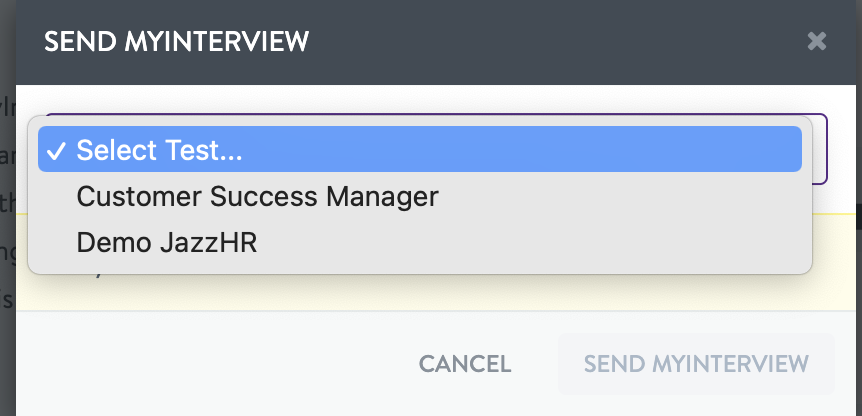Invite Candidates to complete the myInterview from assessments within JazzHR by selecting the previously created job