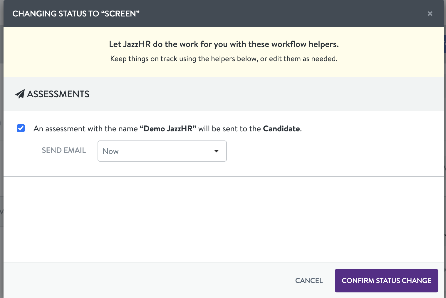 Or create a workflow where the assessment is sent when a candidate is moved to a particular stage in JazzHR