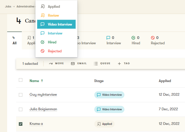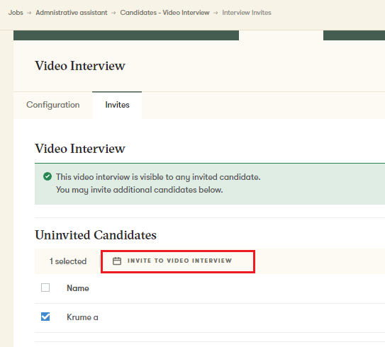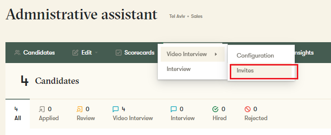 To invite a candidate, progress them to the stage ‘Video Interview’, then navigate to Interviews, Video Interview and Invites.