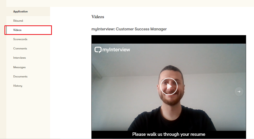 3. To review a candidate's submission, select the candidate within the job and navigate to Videos tab, their interview will be directly embedded for you to review.