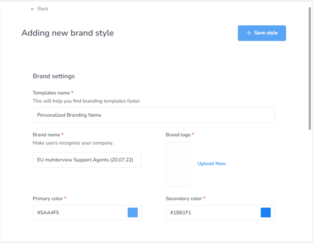 In the Branding section, after writing down your Brand Name, you can also upload or change your signature Company Logo that will display in your interview page. The recommended size is around 8.00 KB, and its dimensions should be around 320x320 pixels.