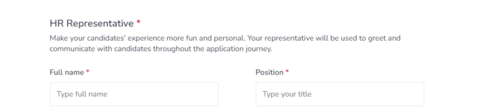 This step is reserved for providing more information about the Employer to your dear candidates. Specifically, the name of the Representative that is hiring, and their position within the company which is hiring. Adding more information will make the video interview experience more fun and personal for the candidates, while also allowing for the representative to greet and communicate with candidates throughout the application journey.