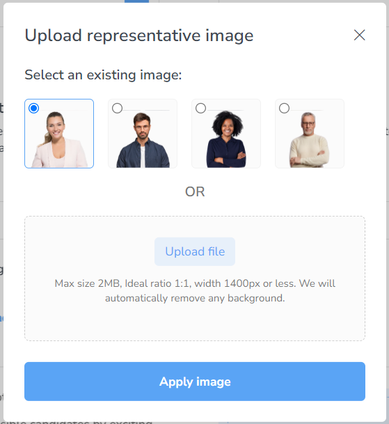 Just below the Brand Color section, you will have the option to upload a brand new Background Image that will display on your interview. You can select a photo from your files or drag and drop on into the box below. Additionally, if you don't have a photo of yourself as a recruiter you can use one of our existing representative images to add a little bit more personality to your Video Interview process.