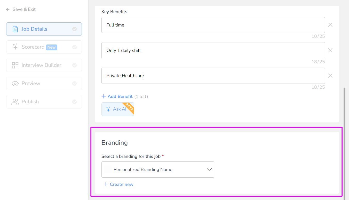To use the revamped Branding Style and your newly-customized Branding Template, you will just need to switch to the Advanced Screening Questions interview mode which you can easily navigate to Settings > Interview Mode, and update it from there. After the changes have applied, when creating a new job, you will notice the Branding section to select your Branding Template on the 1st step of creating the job (Job Details part), just below the Key Benefits section.
