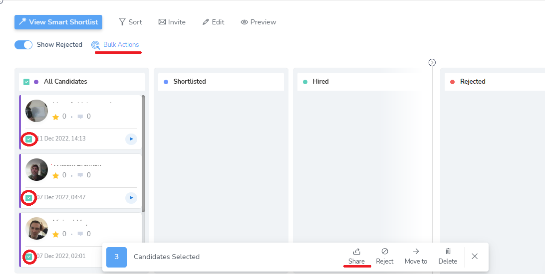 To do that, simply click on 'Bulk Actions', select the candidates you would like to share and then click 'Share' on the bottom right corner.