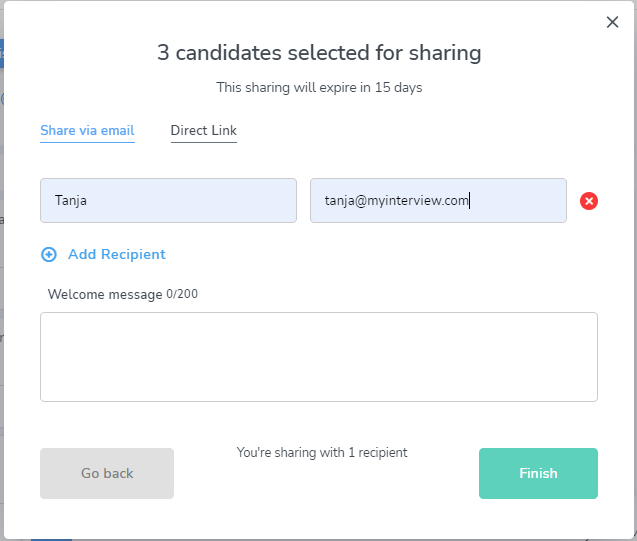 You can share the sets of candidates with as many recipients as you'd like. This can be done via email or direct link. Once you share the candidates with the Hiring Manager or other party, it will expire within 15 days.