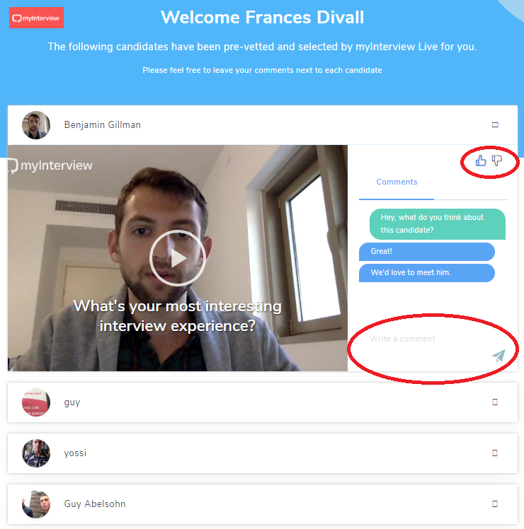 The Hiring Manager or other party can choose to provide their feedback via comments and a thumbs up/thumbs down response. All of the feedback they provide will be visible to you from the myInterview dashboard.