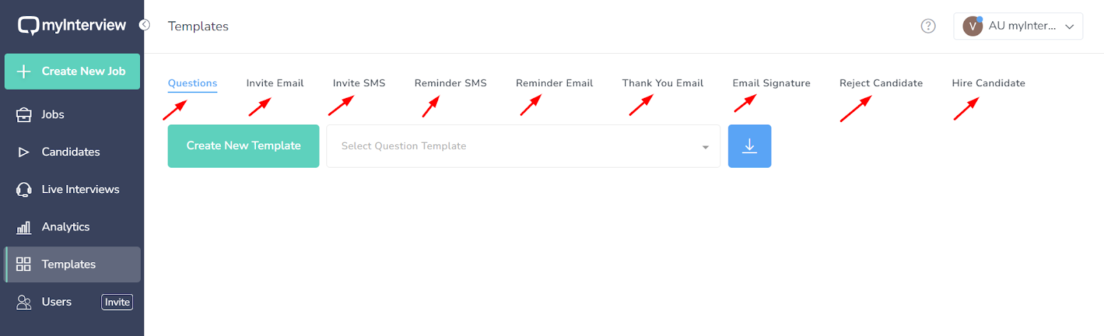 Question templates: The first and foremost tab is our Question Template, where you can Edit one of our signature templates and save it as a New Template, or Update the already existing Question Template to fit your needs. This will save your questions as a template for a specific job, which in turn, will let you upload ready-made questions with just a single click while creating your future job! Please note that updating an existing template might affect live interviews. You may alternatively save this as a new template.