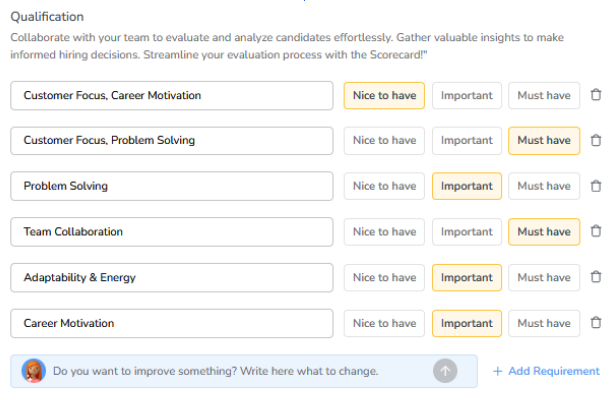 Not every skill is equally critical for every role. To reflect this, Taira allows you to assign a weight to each scorecard trait: